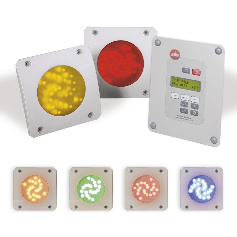 Dispositif de lumières colorées conçu pour les saunas et cabines à infrarouge. Contient 2 champs LED avec câble en silicone, un dispositif de contrôle et un tableau de commande. Séquences chromatiques programmables avec maintien sur chaque couleur ou transitions chromatiques douces