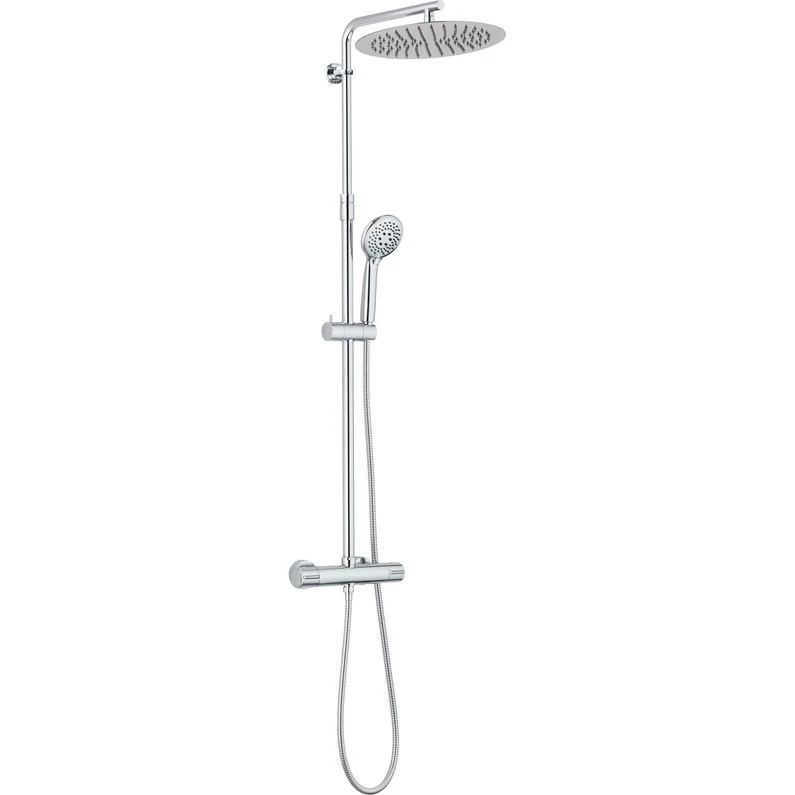 Tête de douche : orientable, Ø 300 mm, extraplate, inox, anticalcaire : picots souples. Bras de douche : télescopique de 0,81 à 1,35 m et rotatif, Ø 20 mm et Ø 24 mm, inox chromé, fixation murale : embase ABS, mobile sur la partie extensible de la barre, support douchette coulissant et inclinable. Douchette : 3 jets (pluie, massage, pluie+massage), Ø 100 mm, ABS entièrement chromée, anti-calcaire : picots souples. Flexible : inox chromé 1,50m, double agrafage pour une solidité renforcée. Robinetterie : thermostatique à cartouche + inverseur céramique intégré, équipé d’un élément thermostatique de fabrication française, poignée métal avec ergot à l’arrière pour une meilleure prise en main, sécurité température 38°C, entraxe de pose 150 mm, adapté à toute production d’eau chaude (1) – (1) En cas de chauffe-eau à production d’eau chaude instantanée, il est essentiel d’avoir des pressions et débits équilibrés entre eau froide et eau chaude et une puissance chaudière de 18kW (250 Kcal/min) minimum pour assurer le bon fonctionnement du thermostatique.