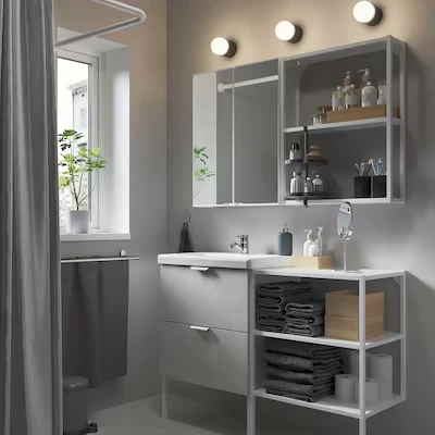De nombreux rangements et de l’espace sur le plan de travail : une solution idéale pour la salle de bain.