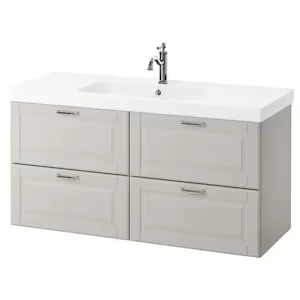 De nombreux rangements et de l’espace sur le plan de travail : une solution idéale pour la salle de bain.
