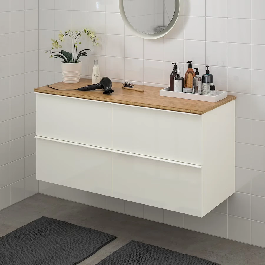 La surface mate du meuble de salle de bain apporte une touche de calme.
