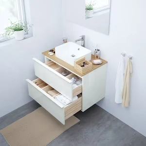De nombreux rangements et de l’espace sur le plan de travail : une solution idéale pour la salle de bain.