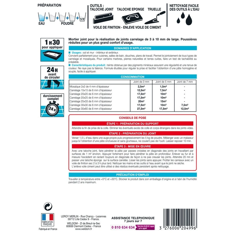 | Nettoyage des outils | A l’eau claire avant séchage |