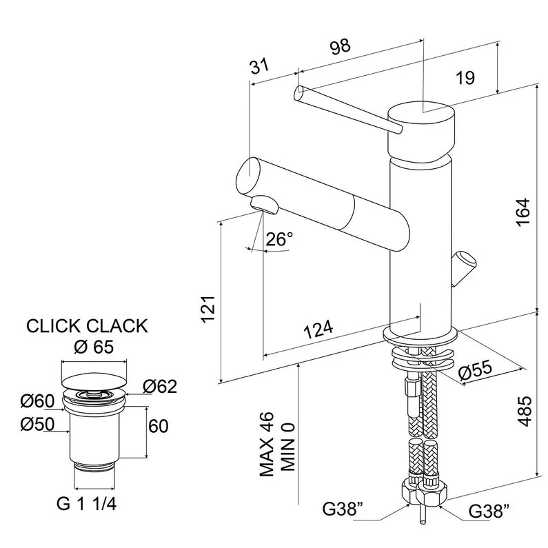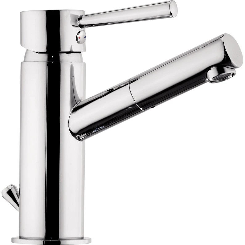 Mitigeur monotrou Lavabo design équipé d’une cartouche à disques céramiques diam 35, manette métal, alimentation par flexibles inox M12/100 x F12/17 longueur 35 cm, fourni avec vidage clic clac en laiton, hauteur totale 164mm, sous bec 121mm, saillie 124mm, Bec orientable chromé.