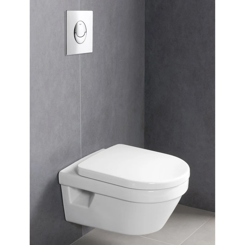 Ensemble Bâti support Grohe Rapid SL Autoportant. Réservoir et mécanisme certifié NF. Réservoir isolé anti-condensation Livré avec plaque de commande double débit (réglage d’usine 3/6L). Chassis en Acier Epoxy.Cuvette suspendue Villeroy et Boch Architectura, cuvette sans bride, abattant déclipsable frein de chute.