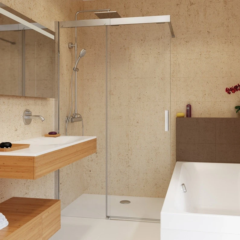 Paroi de douche Walk-In avec partie coulissante. Largeur 140 cm.Partie coulissante en verre sécurité de 8 mm, partie fixe en verre de 6 mm. Accès confortable. Système de fermeture “Soft Close” qui assure un glissement silencieux. Profilé mural réglable de 20 mm