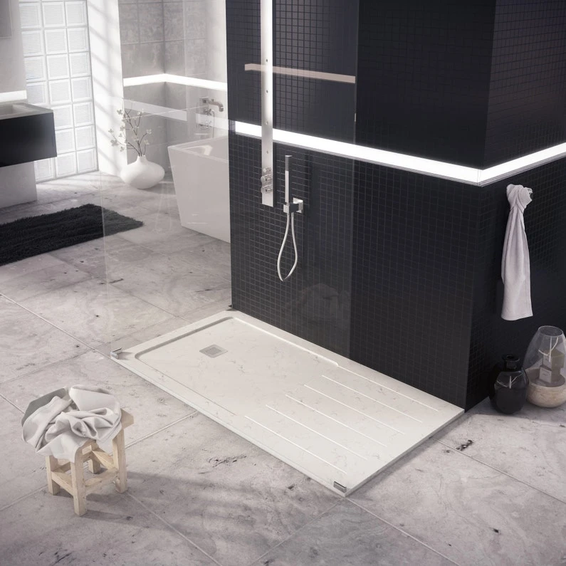 Receveurs de douche extraplats, Antidérapant classe 2, Différentes couleurs disponibles, Facile d’entretien, 0% de porosité, Résistant sur le long terme, Grille Inox incluse