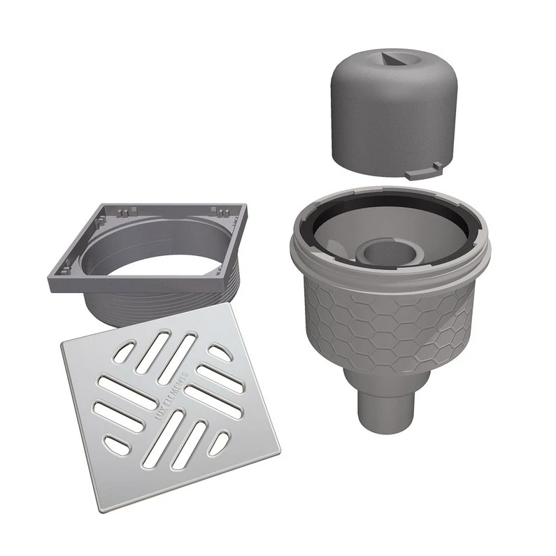 Haut débit d’évacuation. Inclus un obturateur d’odeurs (par remontée). Grille en acier inoxydable et adaptable à l’épaisseur de carrelage.